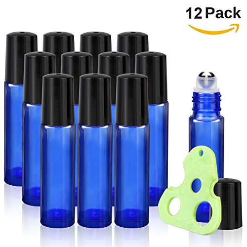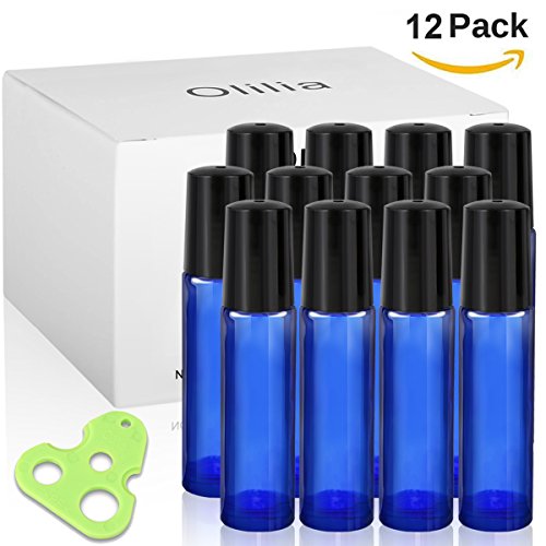 Olilia Glass Roll on Bottles with Metal Roller Balls, Essential Oils Key included 12 Pack of 10ml(1/3oz) (Blue)