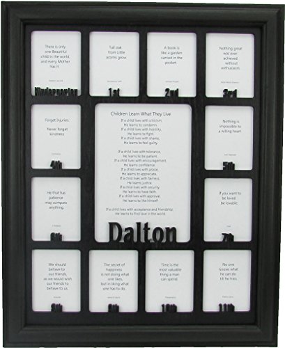 -. Feature : AVAILABLE IN A VARIETY OF COLOR OPTIONS AND COMBINATIONS: All School Years Photo Frames are available in the following colors: Unfinished, Oak, White, Black, Espresso, Stone Gray, Charcoal Gray, Navy, Aqua and Pink. Please let us know the color you'd like, both the Picture Frame and the School Picture Insert to be. You can do so by sending us a message or including it in the "Gift Message" portion of the ordering process. (Pictured is a Black Picture Frame and Black Personalized School Insert) / FITS STANDARD WALLET SIZE SCHOOL PHOTOS: Our School Years Picture Frame is 11 inches by 14 inches. The Personalized School Photo openings measure 2 and 1/4 inch by 3 and 1/4 inch and will fit standard wallet size School Pictures. The center School Photo opening measures 5 inches by 7 inches. / PERSONALIZED WITH YOUR CHILD'S FIRST NAME: This Personalized Picture Frame includes any first name you'd like in the center. Just let us know your child's first name when ordering. You can do so by sending us a message with your child's first name or adding it to the "Gift Message" portion in the ordering process. / HIGHEST QUALITY MATERIALS: Included in your purchase of this Custom Picture Frame is: Handmade Oak Picture Frame, Personalized K-12 School Days Insert, glass to protect all those school photos, decorative p sheet, cardboard backing with easy access tabs, and a sawtooth hanger for hanging. We recommend using scotch tape to secure all those great school pictures in place. / PERFECT GIFT: Our line of Personalized Picture Frames make the perfect gift for mom, gift for dad, or gift for yourself! They also work great as Mothers day gifts, Fathers day gifts, Christmas Gifts, or for any other holiday gifts. All of our School Year Frames are made to order and ship within 5 business days. (As long we have all the information we need from you)