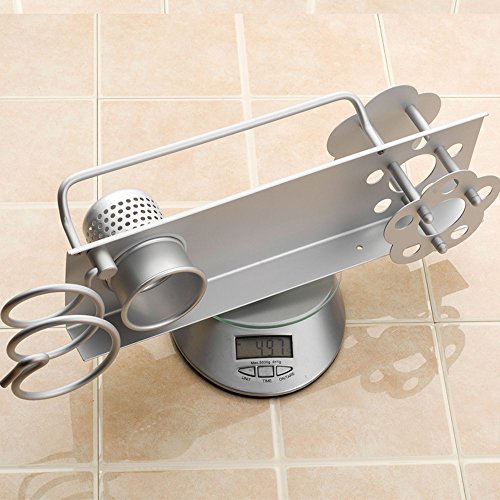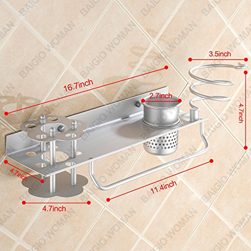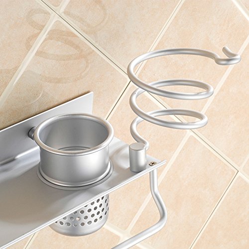 Bathroom Hair Dryer Holder Hair Blow Dryer Comb Holder Organizer Shelf Rack Stand Wall Mounted Hanging Rack with Cup Space Aluminum (with Toothbrush Holder)