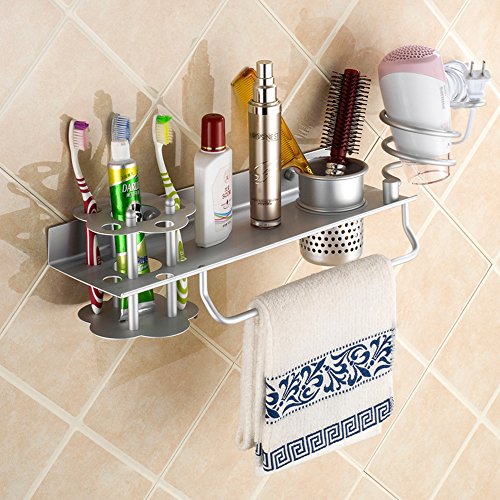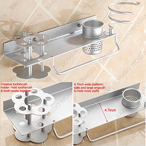 Multi-function storage device, tidy up the bathroom. Holds toothbrush, comb, hair brushes, cosmetics makeup brushes, hair dryer, toothpaste and other bathroom tools to keep your bathroom clean and tidy - space saving, perfect bathroom accessories, makeup organizer.