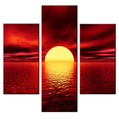 -. Title : KuyiArt- 3 Panels Canvas Wall Art,Framed Art and Stretched P.R.Ints for Wall Decoration, Giclee Canvas P.R.Int,supermoon over sea