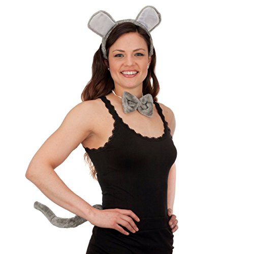 -. Brand : Jacobson Hat Company -. Color : Grey -. Department : womens -. Feature : Includes Headband, bow tie, and tail / Plush bow tie / Plush Headband with Ears / Plush 16 inch tail / Perfect for your mouse costume! -. PackageQuantity : 1 -. ProductGroup : Apparel -. ProductTypeName : ADULT_COSTUME -. Size : One Size -. Title : Fluffy Plush Mouse Instant Dress Up Kit Includes Headband, Tail and Bowtie -. UPC : 763285224720