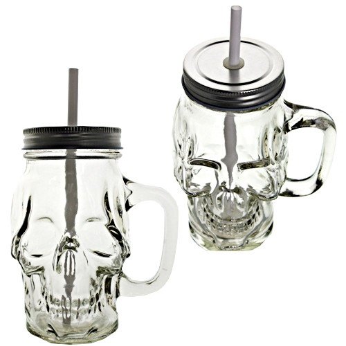 Product Description What a great way to entertain your friends or guests with this skull shaped glass mason jars with handles and sraws. dimensions 5.75" tall length with handle 5" Bottom 3" top 2 5/8". 0