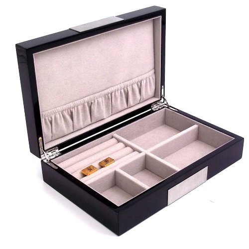 - Black lacquer wood piano finish jewelry box. Multi compartments to store small jewelry, tarnish resistant metal accents.