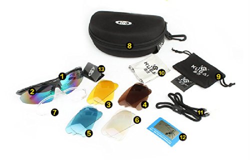 -. Feature : Frame color:black ; Bonus Frame color:black ,white ,red / 5 PC bulletproof space lens:dark gray lenses, Bright yellow graced lenses, brown polarized lenses, bright blue lenses, transparent colorful lenses;UV400 / Ultra-flexible TR-90 frame , high strength toughness, ultra-light quality, excellent impact resistance and abrasion resistance / Perfect for riding,outdoor,driving,fishing,sports / Super toughness Frame+PC explosion-proof lenses
