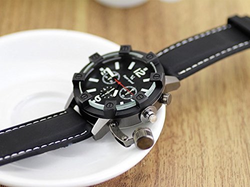 -. Feature : イミテーションクロノグラフがかっこいいアナログ腕時計 / 文字盤サイズ:45mm×45mm 厚:14mm ベルト幅:20mm 腕周:25.0cm調節可能 / 機能:生活防水30メートル / 材質:ステンレス、ゴムベルト / ムーブメント:クオーツ