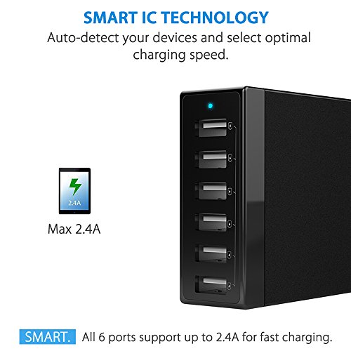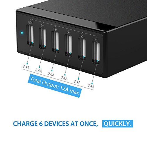 - Feature : 6 x 2.4A output (max 12A overall) lets you charge 6 devices simultaneously with full speed, no need to check which port is 2.4A anymore. / Built-in smart IC can automatically detect and select the fastest possible charging speed for your devices. / Built-in LED indicator shows whether the charger is properly connected. / Multiple safety system to keep your devices safe: overload, over-current, over-heating and short-circuit protection. / What You Get: 60W USB charger, 5ft UL Listed power cord, user manual, TOMMOX 20-month warranty.