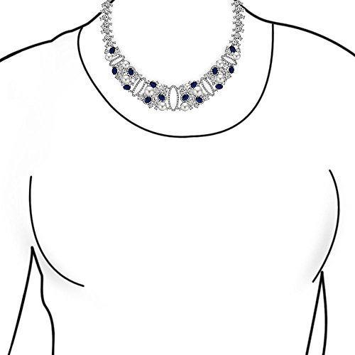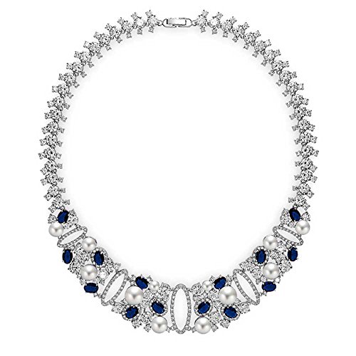Majestic Vintage Style comes to life in this remarkable bridal collar necklace. Elegant and exquisite, this simulated pearl wedding necklace will make an enchanting choice for a wedding or a formal affair. This stunning statement collar features Simulated Sapphire glass ovals clustered with brilliant round cut cz stones and pretty white pearls. an open oval design helps create a classic look giving this Simulated Sapphire necklace a eye catching appeal. This luxurious piece of art Deco Style jewelry is inspired by Estate Style jewelry that add a classic something blue to your wedding. an excellent bridesmaids gift, or mother of the bride gift, this piece of pearl jewelry will give look and feel of a regal wedding. Your wedding day photos will certainly look sensational. Order yours today.Feature