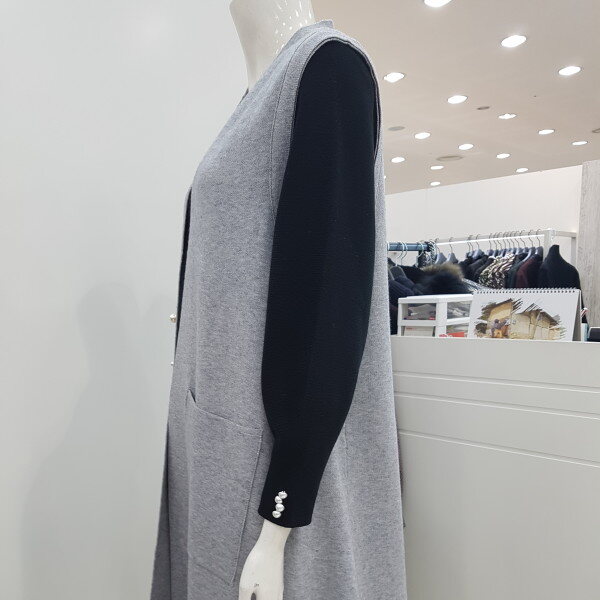롱한 기장의 니트 베스트 스타일로 체형 보완을 해주며 밑단이 살짝 훌지는 스타일로 여성스러우면서도 멋스럽게 입기 좋은 스타일 입니다. 밋밋한 스타일에 걸쳐주기만해도 멋스럽고 고급스러운 분위기를 자아내는 스타일로 여러 스타일로 코디하기 좋습니다.