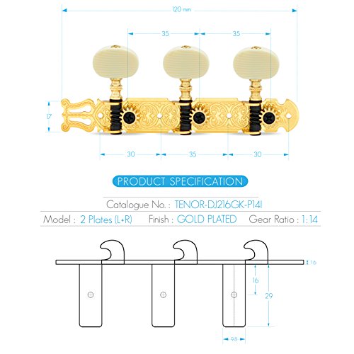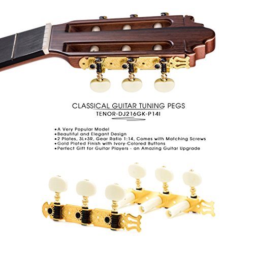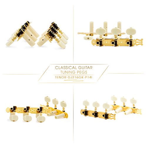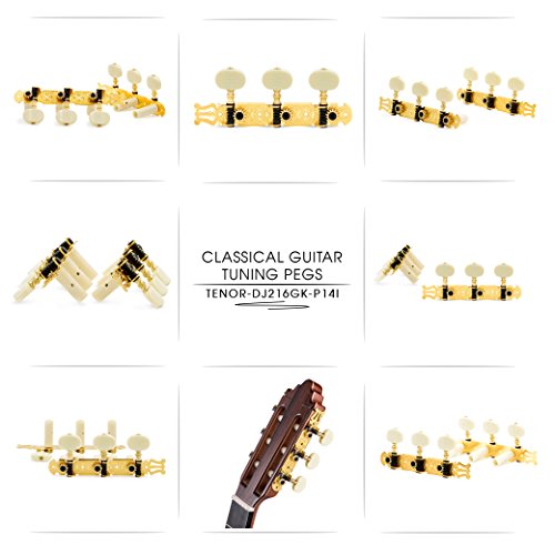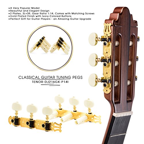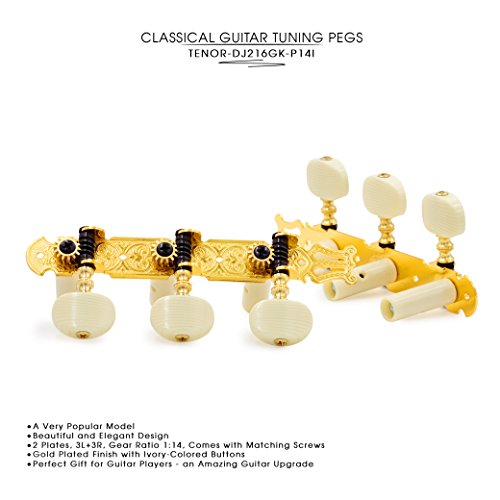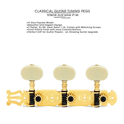 DJ216GK-P14I TENOR Classical Guitar Tuners, Tuning Key Pegs/Machine Heads for Classical or Flamenco Guitar in Black and Gold with Ivory Colored Buttons.