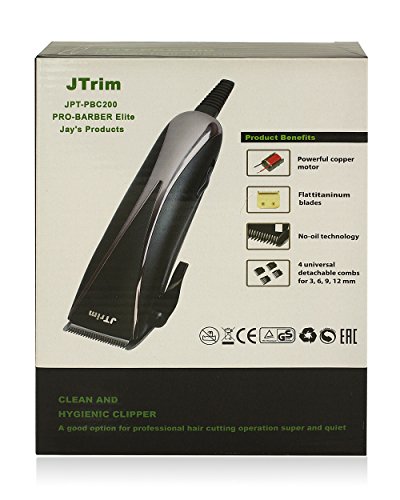 Hair Clippers for Men By JTrim PRO-BARBER Elite Electric Beard Trimmer Corded Hair Trimmer Jay``s Products The JTrim RRO-BARBER Elite Made Of Titanium Fixed Blade And Titanium Moving Blade will Last Longer High Quality Powerful Copper Motor _Durable And Quiet & Low vibration For Professional And Personal Use Adult and Kids 4 Comb Attachment 1/8-7/8 _ The Blade Cutting Height Can Be Adjusted From .08-3.0 mm The Blades is Replaceable And will Be Available soon No Oil Technology 30 days free trial - 110V US Plug _ 1 Year warranty