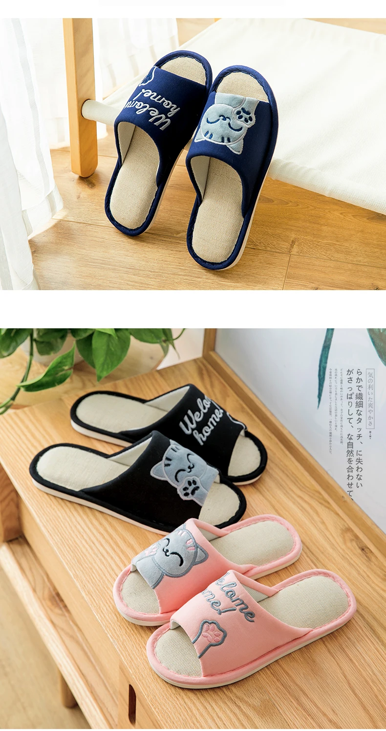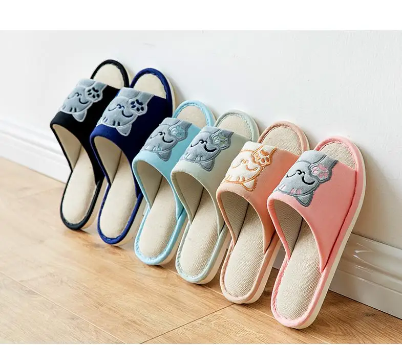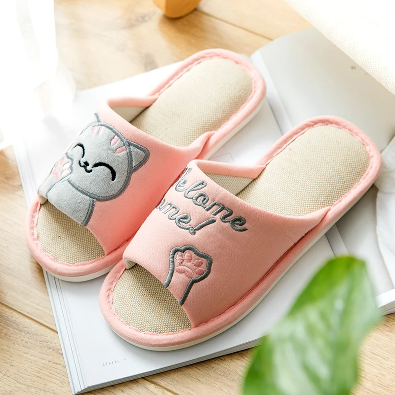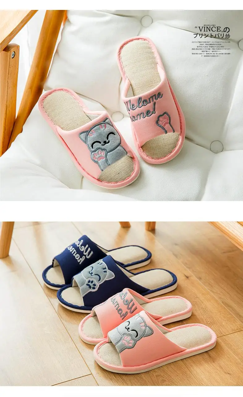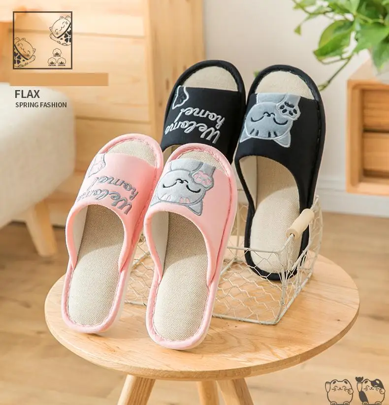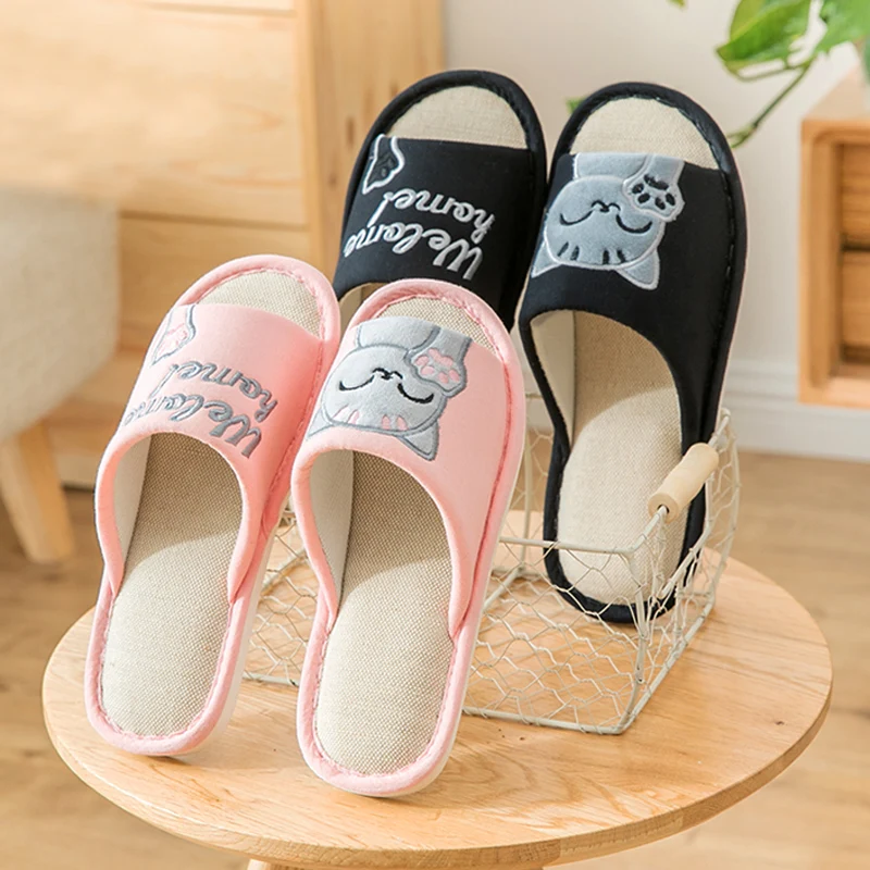 Women Slippers Linen Cute Cat Cartoon:Comfortable Slip On Home Slippers