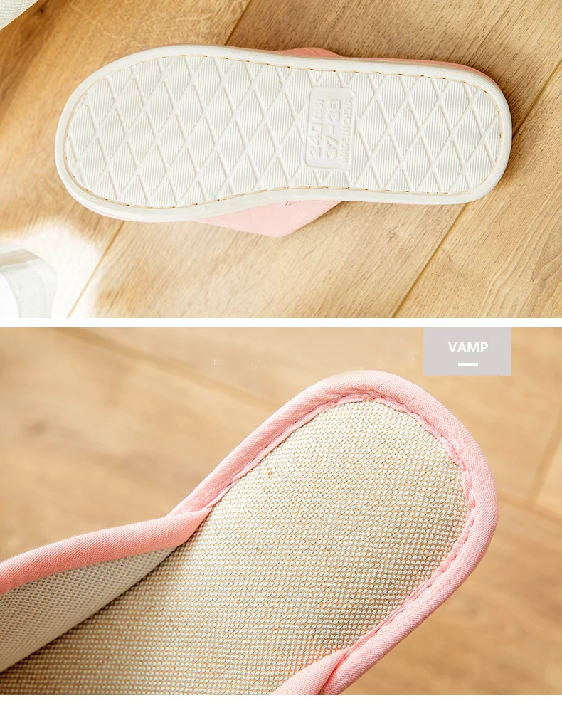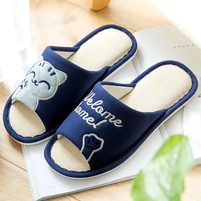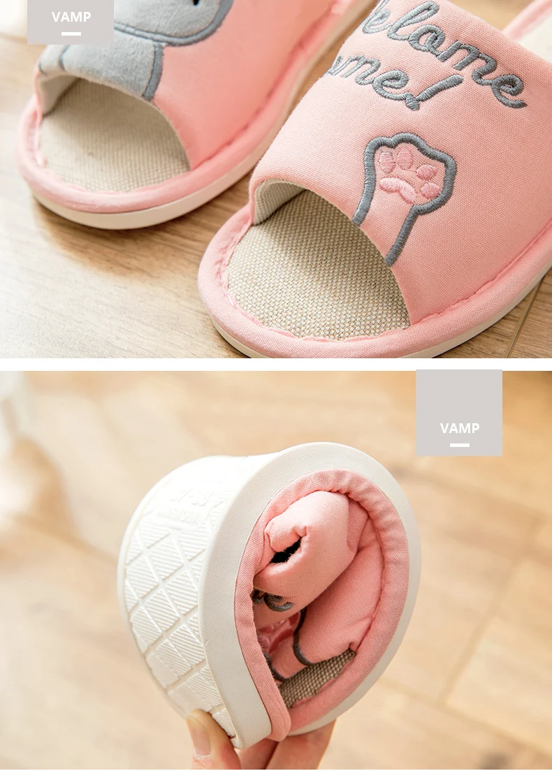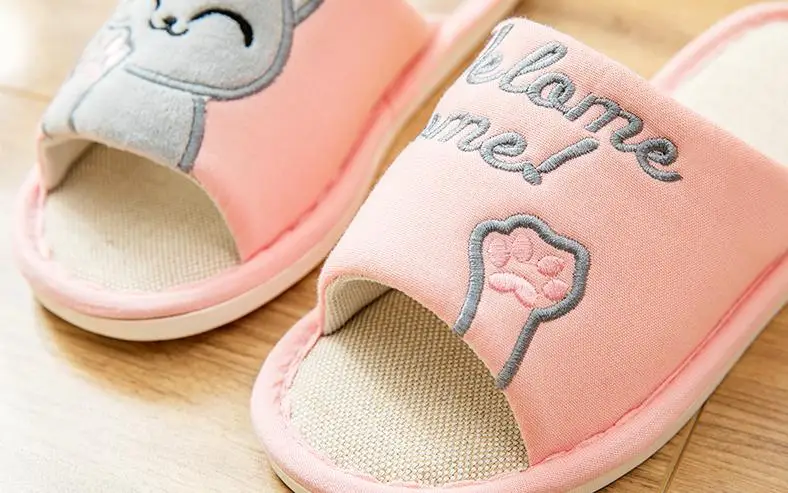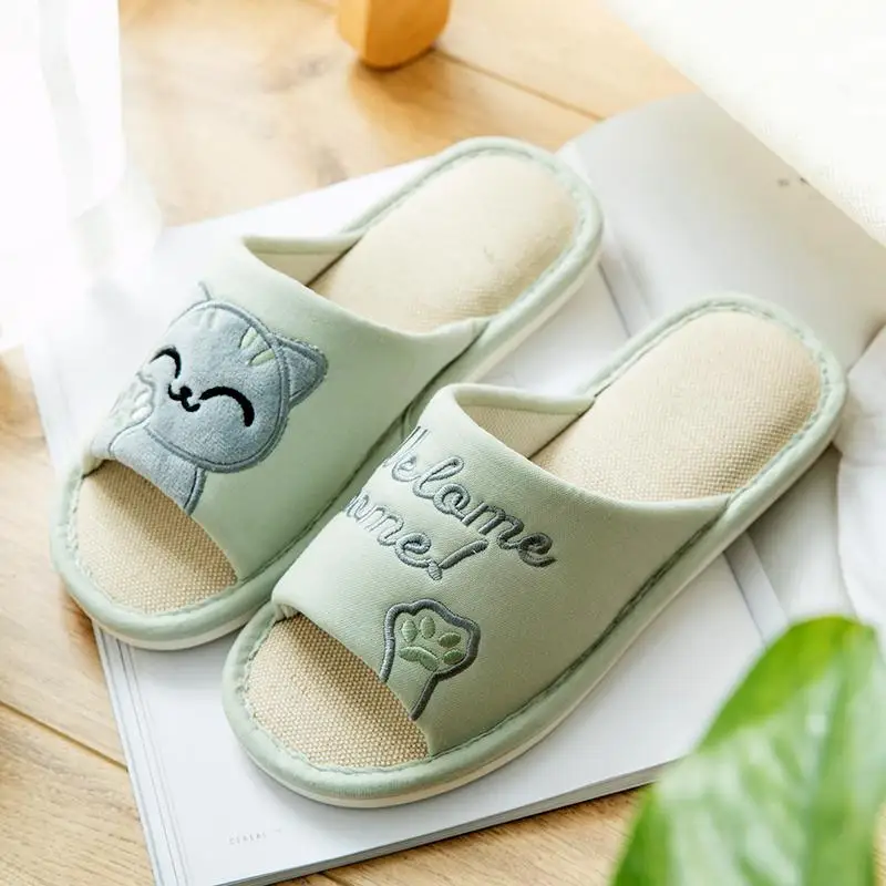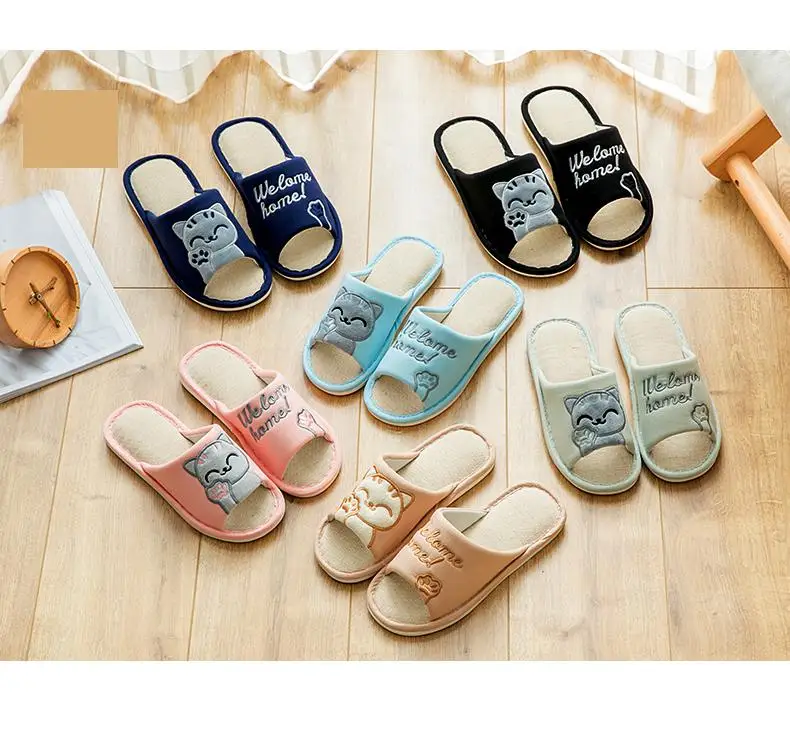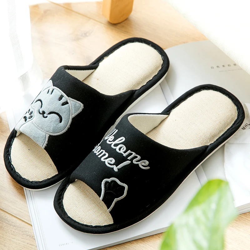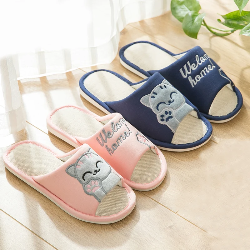 Women Slippers Linen Cute Cat Cartoon:Comfortable Slip On Home Slippers
