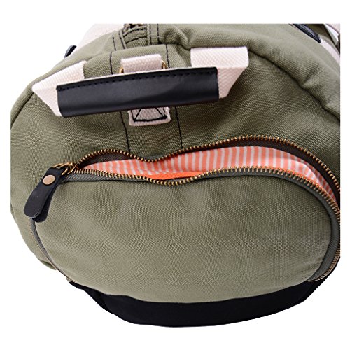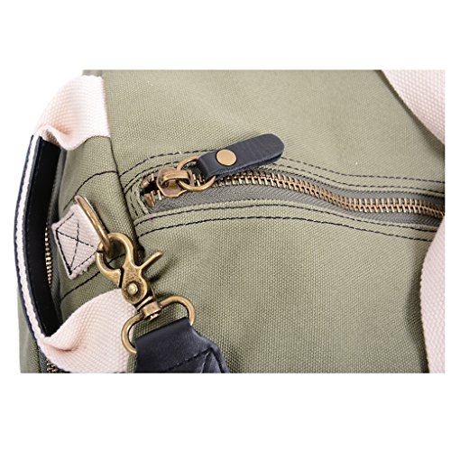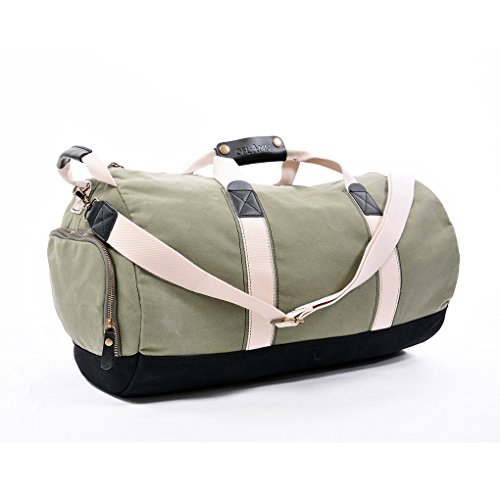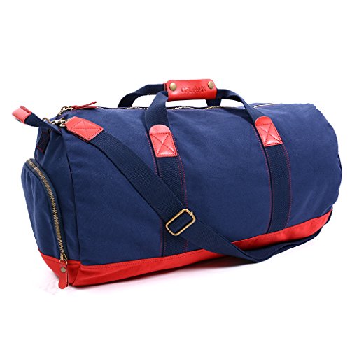 -. Feature : Upgraded Version: Genuine leather on multiple location of the duffle bag, makes it less sporty and more versatile. More pockets inside,for you to better organize your stuff. Better craftsmanship. / Quality: Premium quality Canvas , Genuine Leather, Cotton lining, Brass Accessories.Ensure a long life of the bag. / Size: 21 x 11.5 x 11.5 inch (L x W x H),45 Liters capacity.Ideal size as a sport bag, gym bag or duffel bag. / Shoes Compartment: Built in shoes compartment,easy access and keeps your gear neat and tidy. / Design: Eye-pleasing contrast color,excellent material,craftsmanship and structure.A Great combination of fashion and function.
