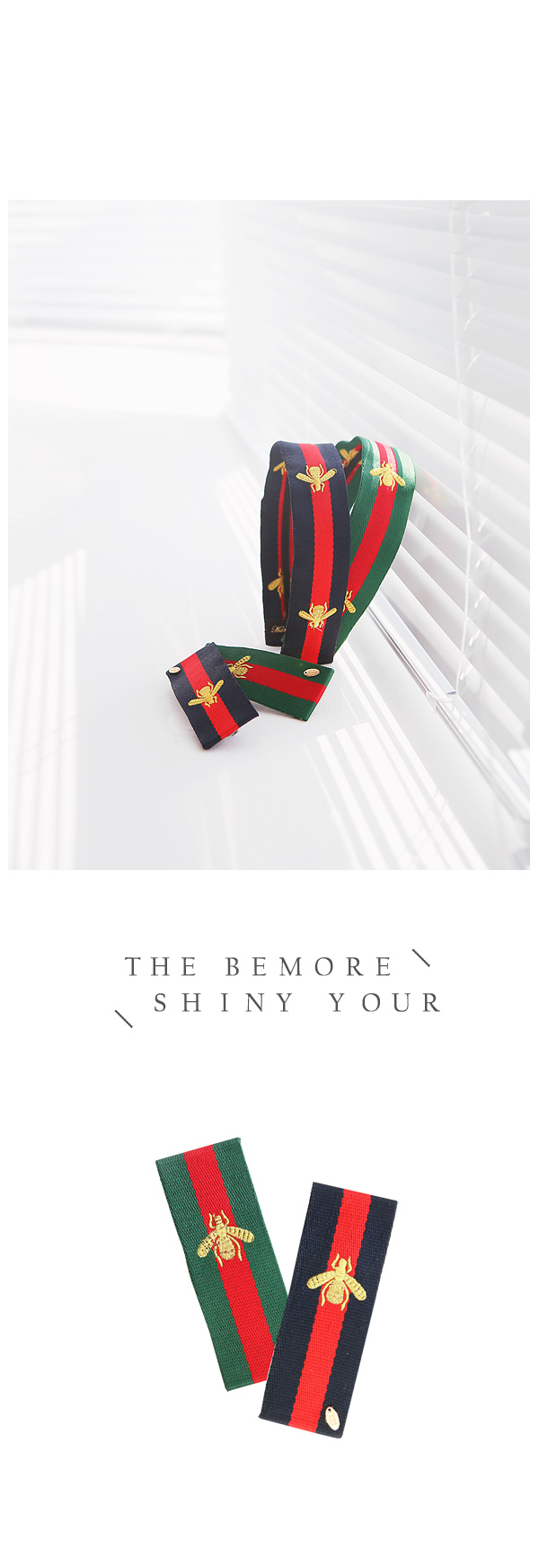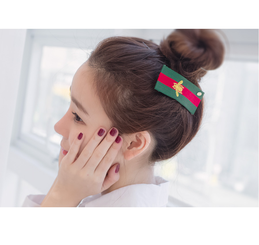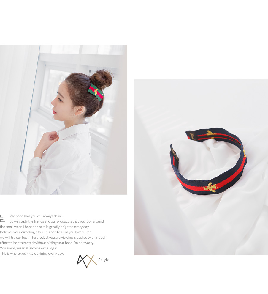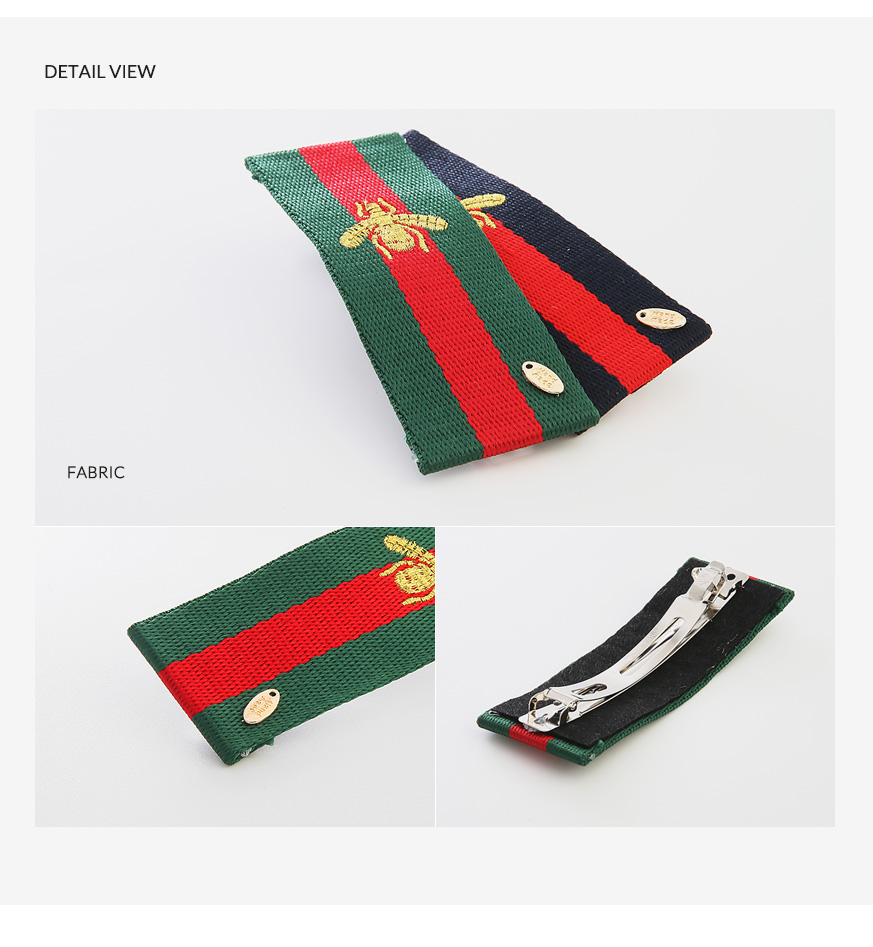 시원시원한 스트라이프 무늬에 꿀벌을 수놓은 유니크한 디자인의 헤어핀입니다.군더더기 없이 심플한 디자인에 비비드한 컬러감으로 도시적인 세련미가 느껴지는 제품입니다.페브릭의 짜임이 눈에 보일만큼 굵직한 텍스처과 도톰한 두께감으로 흔하지 않은멋스러움을 느낄수 있어요.캐쥬얼룩에 시크하고 깔끔한 느낌으로 좋은 아이템입니다.
