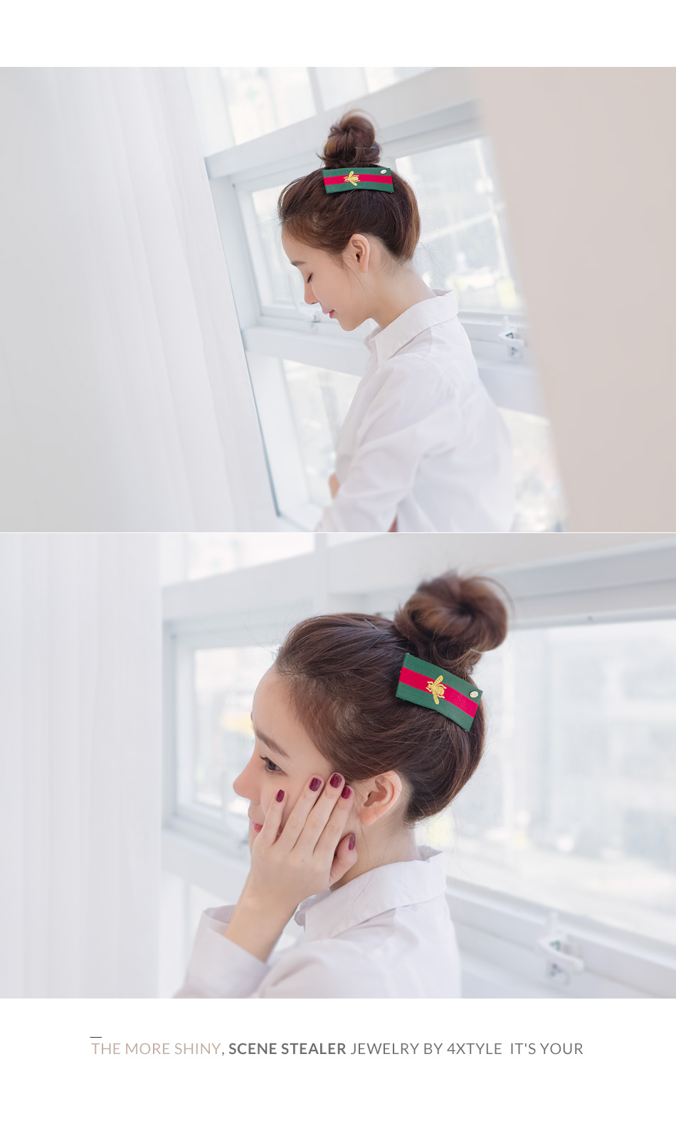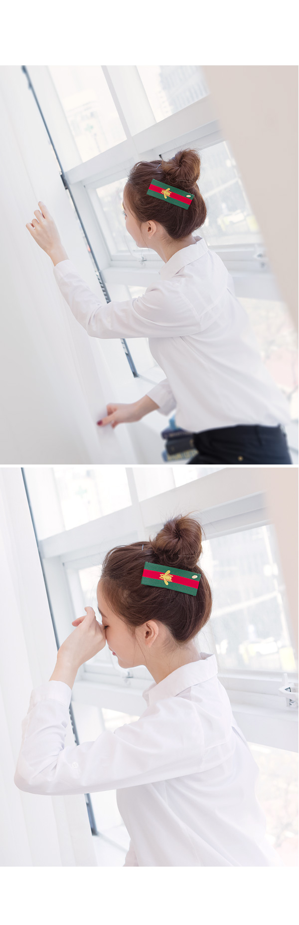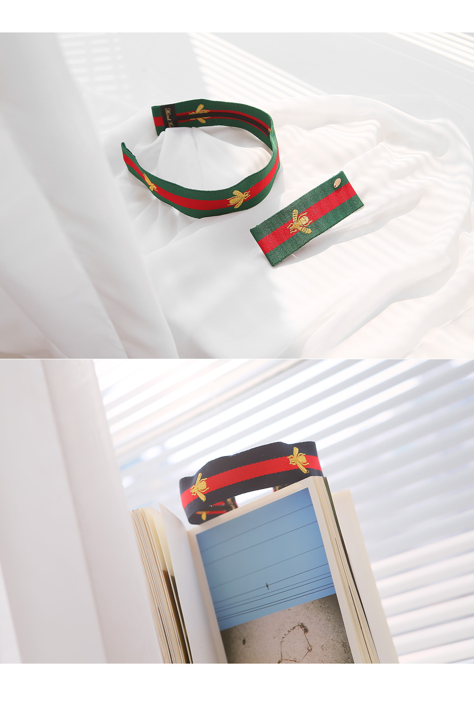 시원시원한 스트라이프 무늬에 꿀벌을 수놓은 유니크한 디자인의 헤어핀입니다.군더더기 없이 심플한 디자인에 비비드한 컬러감으로 도시적인 세련미가 느껴지는 제품입니다.페브릭의 짜임이 눈에 보일만큼 굵직한 텍스처과 도톰한 두께감으로 흔하지 않은멋스러움을 느낄수 있어요.캐쥬얼룩에 시크하고 깔끔한 느낌으로 좋은 아이템입니다.