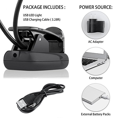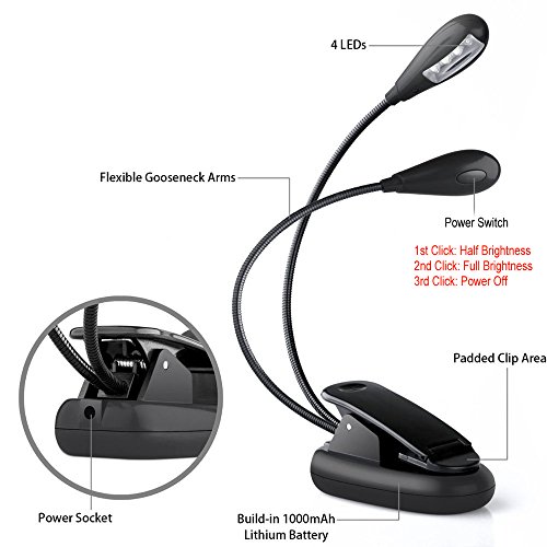 - Easy to Use: No more waste of money on batteries. The light can be charged by the power adapter,a computer or power bank connecting with the USB cable. With this light you can read for up to 10 hours without charging. The light is comfortable to hold. One click on the head's switch botton will turn on the light at low level, a double click will change to high level and a third click will turn off the light.You can also choose to turn on one head or two as needed.
