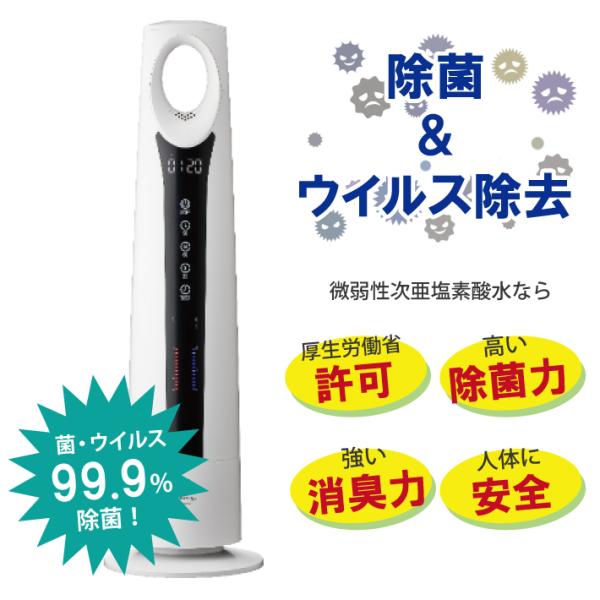 約0.5ミクロンの弱酸性次亜塩素酸水の超微粒子ミストが部屋の隅々までいきわたり(1台で約30畳)、除菌・消臭を促します。