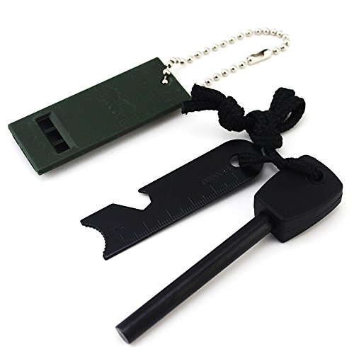 MAIYU SURVIVE MAGNESIUM FLINT FIRE STARTER SURVIVE MAGNESIUM FLINT FIRE STARTER BLACK HANDLE, BOTTLE OPENER, SERRATED EDGE, MINI RULER AND RESCUE WHISTLE