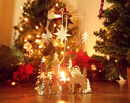 Studio : Banberry Designs Publisher : Banberry Designs Binding : Kitchen Product Description Banberry DesignsTM original silver plated laser cut candle spinners are the perfect addition to your holiday decor. This Banberry original has a laser cut nativity scene and spinning star charms. It comes with a smokeless, white tea light candle. When the candle is lit, it will cause the charms to spin around. You will love this fascinating and beautiful spinning candle holder collection. 0