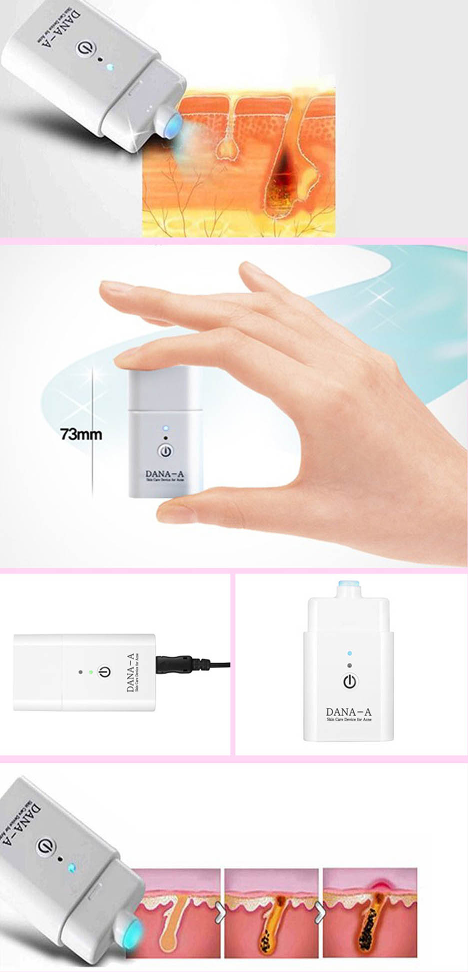 The Dana-A skin care device for acne uses a unique patented technology combining the benefits of blue ray and a special heat controlled by a microprocessor. It only takes 2 minutes and 30 seconds to care for each acne area. The blue-ray light generated by the bio-ceramic tip kills the bacteria that causes acne from inside the oil producing glands and the heat sterilises the acne area. Dana-A also relieves mosquito bites.
