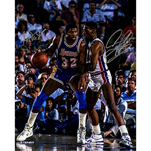 Magic Johnson Posting Up Dennis Rodman Dual Autographed 1989 NBA National Basketball Association Finals Autographed 16 Inch X 20 Inch Photo