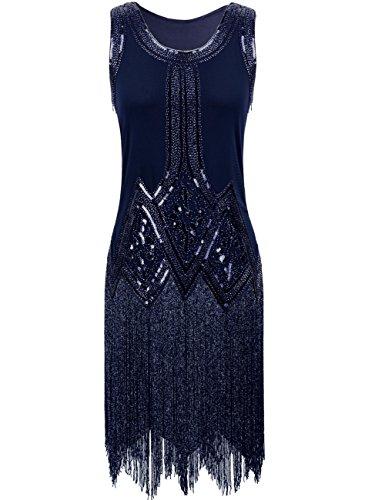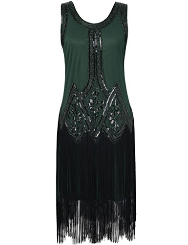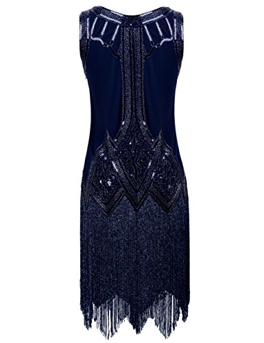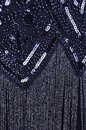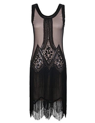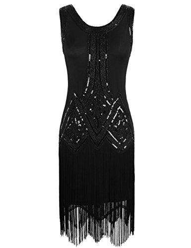 This black dress is another respect of the 1920s ,low-key , elegant ,but not ordinary at all.Embellished with large quantity of metal beads,several sequins,and black tassel which interspersed with gold line,express the visual beauty.This dress mixed with modern and vintage, originality and inspiration, passion and sagaciousness.Its modern stylish twist and true inspiration to the Vintage Sensation inspired everyone.Feature