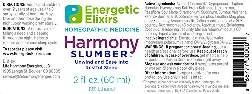 -. Binding : Health and Beauty -. Brand : Life Harmony Energies -. EAN : 0866777000007 -. Feature : Unwind and ease into restful sleep with a few sprays at bedtime / Natural & safe homeopathic sleep aid - no grogginess upon waking / Powerful dual action remedy - unique energized water + homeopathic ingredients / 2 liquid ounces - approximately 1 month supply when used daily / Try it risk-free with our 60 day money back guarantee -. Label : Life Harmony Energies -. Manufacturer : Life Harmony Energies -. MPN : EEHS-Spray -. PackageQuantity : 1 -. PartNumber : EEHS-Spray -. ProductGroup : Health and Beauty -. ProductTypeName : HEALTH_PERSONAL_CARE -. Publisher : Life Harmony Energies -. Studio : Life Harmony Energies -. Title : Harmony Slumber Homeopathic Dual Action Insomnia Natural Sleep Aid Spray -. UPC : 866777000007