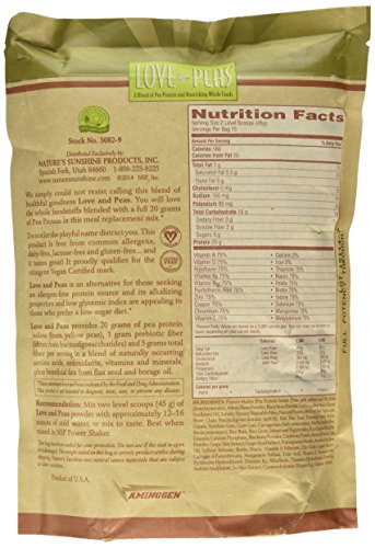 -. Binding : Health and Beauty -. Brand : Nature's Sunshine -. EAN : 0099904030824 -. Feature : Provides 20 grams of vegetable protein per serving; Offers a balanced amino acid profile / Provides 75% of the Daily Value of 18 vitamins and minerals / Supports the urinary and circulatory systems / Contains a powerful antioxidant blend / Is free from common allergens, dairy, lactose and gluten; Is certified vegan -. Label : Nature's Sunshine Products -. LegalDisclaimer : These statements have not been evaluated by The Food and Drug Administration. This product is not intended to diagnose, treat, cure, or prevent disease. -. Manufacturer : Nature's Sunshine Products -. MPN : 3082-9 -. PackageQuantity : 1 -. PartNumber : 3082-9 -. ProductGroup : Health and Beauty -. ProductTypeName : HEALTH_PERSONAL_CARE -. Publisher : Nature's Sunshine Products -. Studio : Nature's Sunshine Products -. Title : Love and Peas (675 g) -. UPC : 099904030824
