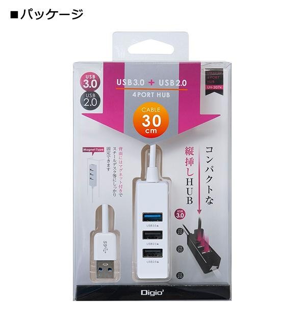 コンパクトな縦挿し4ポートハブです。底面マグネット付きでスチールデスク等に固定できます。4ポートのうち1ポートが「USB3.0」、3ポートが「USB2.0」対応となっています。 |