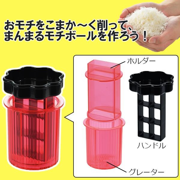 fk094igrjs簡単にモチを細かく削ることができるスライサーです サイズ (約)75×75×107mm 個装サイズ:7.5×7.5×13.5cm 重量 約109g 個装重量:133g 素材・材質 ABS樹脂(耐熱温度:80度、耐冷温度:-30度) 仕様 食洗機不可 セット内容 ホルダー、グレーター、ハンドル 生産国 日本 切りモチをセットしてハンドルを回すだけ 簡単にモチを細かく削ることができるスライサーです