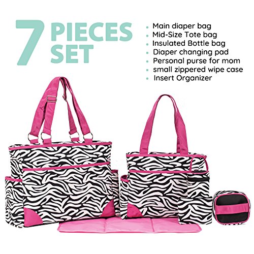 The Mommy Essentials 6-piece Diaper Tote Set is an unmatched value, and the complete solution for taking baby on the go. The large tote bag, a smaller tote bag and comes with a matching changing station, insulated bottle bag, an accessory wipe case with handle and 2 small accessory cases for mom to organize. This set is everything a busy mom needs. Made of 100% Polyester. Easy to wipe clean. Limited time offer. While supplies last.