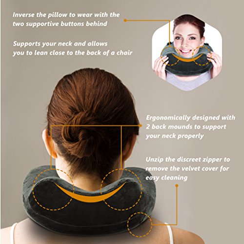 - CONTOURED SUPPORT & SOFT VELVET FABRIC: Raised mounds support the back of your head and neck, enhancing the health of your cervical vertebrae; inverse the pillow to wear with the 2 supportive buttons behind; ergonomically designed to fit comfortably when worn in various ways; soft micro-velvet fabric cover; premium quality and very light weight; removable and washable for easy maintenance