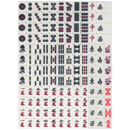 144 Tiles Contain: 36 Circles, 36 Bamboos, 36 Characters, 12 Dragons (red, green and white), 16 Winds (N, S, E, W), 4 Flowers, 4 Red Fives