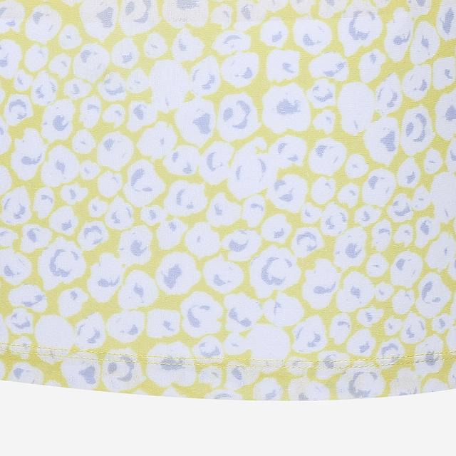 화사한 컬러 바탕에 카라 부분에 레이스 소재를 배색하고 독특한 패턴을 매치하여 포인트를 준 티셔츠입니다.