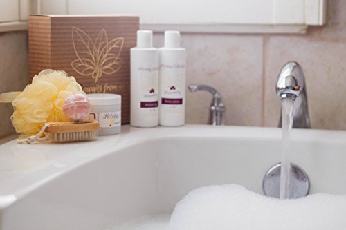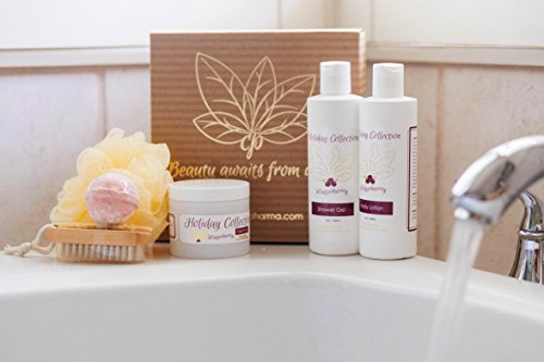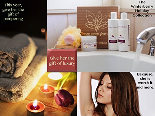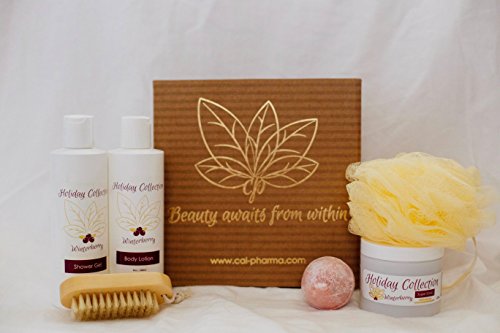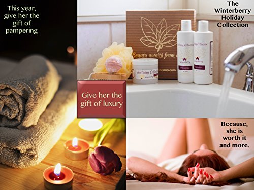 Give your loved one a personal holiday with this "Holiday Winterberry Collection" gift-set. Includes essential oil natural bath and body works treats: Body Lotion (8 oz), Shower Gel (8 oz), Sugar Scrub (4 oz), Loofah Bath Sponge, Bath Bomb, and Scrub Brush