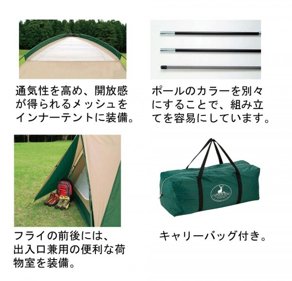ポールカラーを分けることで組立が容易。インナーテント出入口にはプライバシーを確保するノーシームメッシュを採用。開放感あるメッシュをインナーテント天井に装備、フライの前後に出入口兼用の荷物室を装備しています。インナーテントには小物入れに便利なメッシュポケット付き。紫外線95%カット!UV-PROTECTIONコーティング生地を使用。収納や持ち運びに便利なキャリーバッグ付き。 |