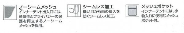 | 素材・材質 | フライ:ポリエステル70D(PU1000mm)、インナー:ウォール:ポリエステル70D(通気性撥水・防水)、グランドシート:ポリエステル150D(PU1000mm)、メッシュ:ポリエステルノーシームメッシュ、ポール:Φ11.2mmグラスファイバー |