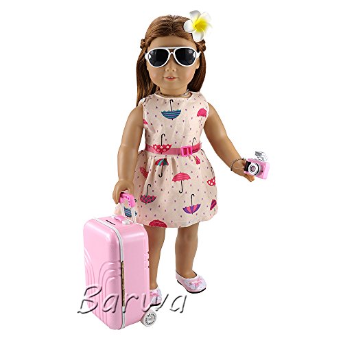 Travel set for American girl doll, including 1pc pink suitcase, 1pc pink camera, 1 pairs sunglasses, 1 set play card, 1 pc flower hair clip.