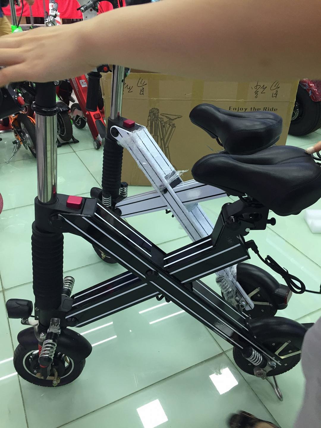 Creative: 8-inch electric folding car, the use of X-type design, a second folding, subway, bus, at any time, 36V 7.5Ah lithium battery, charging 3-5 hours, life 20-25Km! Black / white / powder optional. 商品详情 创意型:8寸电动折叠车,采用X型设计,一秒折叠,地铁、公交,随时上,36V 7.5Ah锂电池,充电3-5小时,续航20-25Km!黑/白/粉可选。