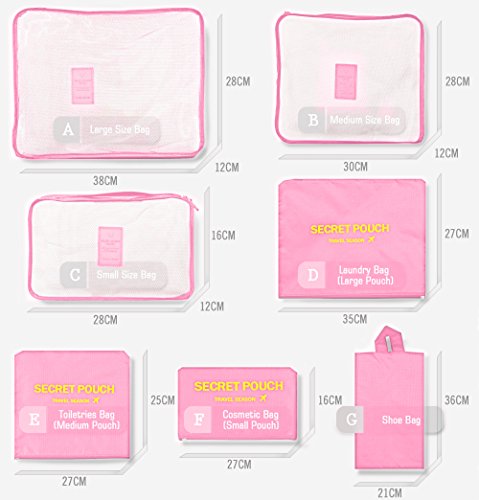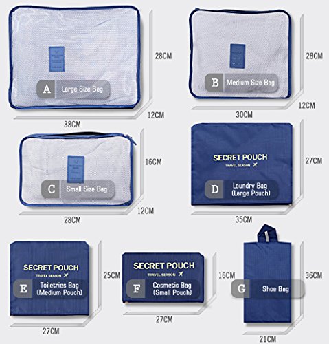 PACKAGE INCLUDES: -3 Packing Cubes - Large (15.7" x 11.8" x 4.7") Medium (11.8" x 11" x 4.7") Small (11.8" x 7.9" x 4.7") -3 Laundry Pouch - Large (13.7" x 10.6") Medium (10.6" x 9.8") Small (10.2" x 6.3") -1 Shoe Bag (14.2" x 8.2")
