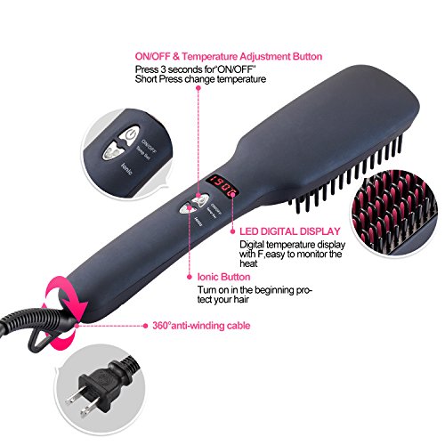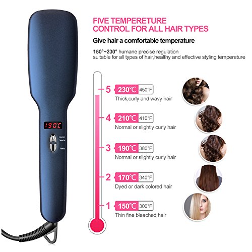 - Controllable Temperatures:One button for five levels temperature settings with LED display on brush handle.Adjust heat temperatures from 150℃(300℉) to 230℃(450℉) allow you to match your specific hair type: thin, fine, bleached, wavy or curled.Dual voltage operation support: 100V~230V