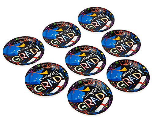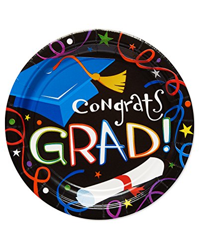 Studio : American Greetings Publisher : American Greetings Binding : Kitchen Product Description Congratulate the Grad in style! these convenient dessert plates feature a bold and colorful design with fun lettering and images of a mortarboard, a diploma, swirls, stars and Dots. With a sturdy construction, 7-in. Size and a beveled edge, they're perfect for serving ice cream, cake, snacks and much more to all your guests! plates come in packages of eight and are disposable, providing quick and easy cleanup when the celebration ends. Coordinate with other graduation-themed party ware to create a memorable table setting!. 0