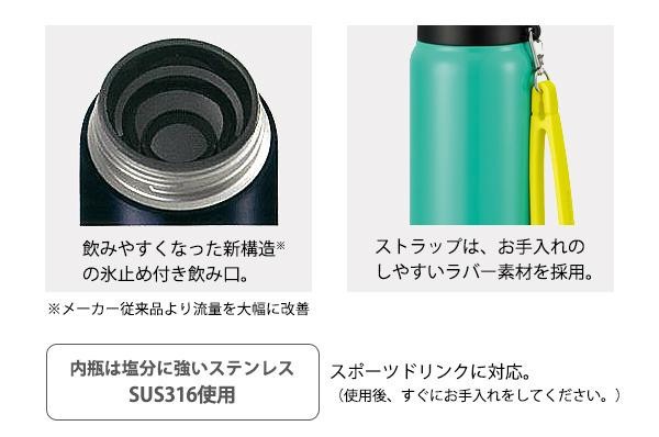 ストラップには水に強い弾力性のあるラバー素材、内瓶には塩分に強いステンレスを採用しアクティブシーンに最適!!魔法瓶構造でしっかり保温・保冷ができ、おいしさをキープ。丸洗いできるので清潔にお使いいただけます。 |