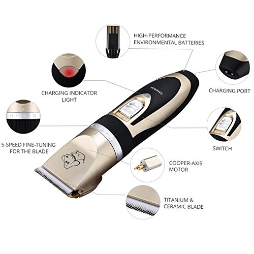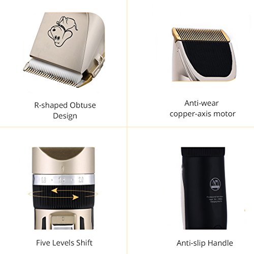 Rechargeable dog trimmer with built-in battery is good for exceptional flexibility and maneuverability. And the clipper itself has 5 adjustable functions for the comb from 0.8mm to 2mm.