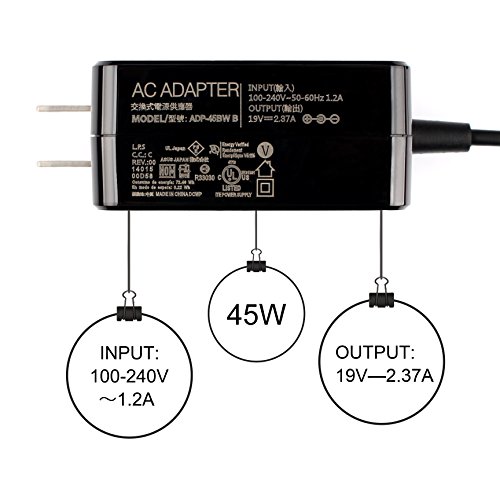 -. Feature : Replacement charger for Asus Q504 Q504U Q504UA Q504UA-BBI5T12 2-in-1 - 15.6" FHD Laptop, ASUS Q304 Q304U Q304UA Q304UA-BBI5T10 2-in-1 - 13.3" FHD Laptop, Asus Q503 Q503U Q503UA Laptop, Asus Q324 Q324U Q324UA q324ua-bhi7t17 / Replacement charger for ASUS Transformer Pro T304UA T304U , Asus-Vivobook S200 S200E Q200 Q200E Q302LA Q302UA Q503UA Q504UA X102 X200 X201 X200CA X202E X540LA X540SA F102 F201 F202 F556UA E402SA E403SA ; Zenbook UX303UA UX303UB UX305CA UX305FA UX305LA UX305UA UX330UA UX360CA Flip; Zenbook Prime UX301 UX302 UX301LA UX303LA UX303LN UX21A UX31A UX32 UX32A UX32VD UX42 UX52 U38; Taichi 21 31; Transformer Book T300 T300LA TP300 TP300LA TP300LD TX201 TX201LA / Replacement charger for Asus Zenbook UX305 UX305F UX305FA UX305FA-USM1 Q302 Q302L Q302LA Q302U Q302UA UX330UA UX360CA UX305FA Q302LA UX31A, UX21A, UX32A, UX32VD, UX301, U38N, U38DT, UX42VS, UX50, UX360 UX360C UX360U UX360UA UX360CA UX360CA-DBM2 UX52VS / Replacement charger for Asus TP510UA F542UA F542U Q505U Q505UA-BI5T7 / AC Input: AC 100-240v, 50-60Hz, 1.7A, DC Output: DC 19v 2.37A 45W Connector Size:4.0*1.35mm Come with one Dongle 4.0*1.35 to 5.5*2.5 Converter Cable (value $6 ) , so it can also use for the other 5.5*2.5 mm plug laptops !Please see full list of compatible models in the Product Description. Check Connector Size to Ensure Compatibility 12 Months Warranty, 30 Days money back