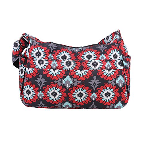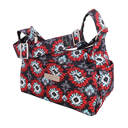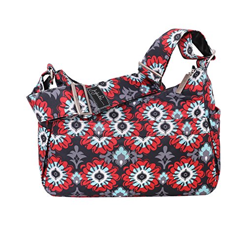 The Ju-Ju-Be HoboBe Purse Diaper Bag is chic, smart and functional with added innovation and versatility. Packs up great for baby, the HoboBe Diaper Bag looks like a fashionable purse but has all the same features as an ordinary diaper bag. When you`re ready, take out the included memory foam changing pad for a full-fledged purse. How's that for flexible and fun? Be yourself and more with the HoboBe. The inner lining is protected with Agrion natural antimicrobial treatment, which inhibits and reduces the growth of odor-causing bacteria, mold and mildew. The outer fabric is treated with Teflon fabric protector so you can repel stains and keep your Hobo Be clean. The front ``mommy`` zippered pocket is large enough for smartphones, wallets, keys and other personal items. The main zipper pocket is large enough for diapers, wipes, soft toys and other items for quick trips. The back pocket is perfect for magazines or books. (2) bottle pockets are located on either side of the bag and insulated to keep your items hot or cold. The Sweet Scarlet print is featured on this bag with silver hardware. The adjustable memory foam shoulder strap has textured fabric underneath to prevent the bag from sliding off your shoulder. This bag is machine washable and measures 13.5-inches by 9.5-inches by 5.5-inches in size. The Ju-Ju-Be HoboBe Purse Diaper Bag comes with a 90-day limited warranty that protects against manufacturing defects. Founded in 2005, Ju-Ju-Be is a Southern California company that fuses science, style, and attitude to create diaper bags, purses and other accessories that are both fashionable and fun. Ju-Ju-Be assimilated the most advanced technology possible to create a stylish and intelligent product line that`s unrivaled in the industry.Feature