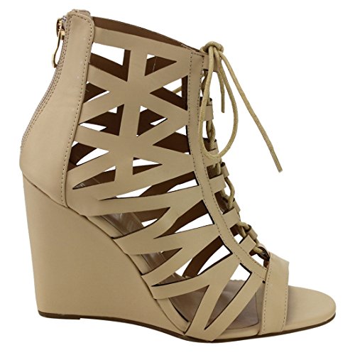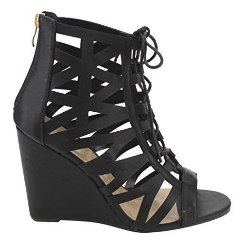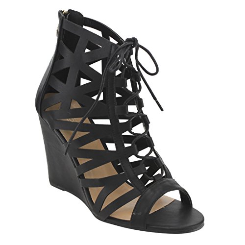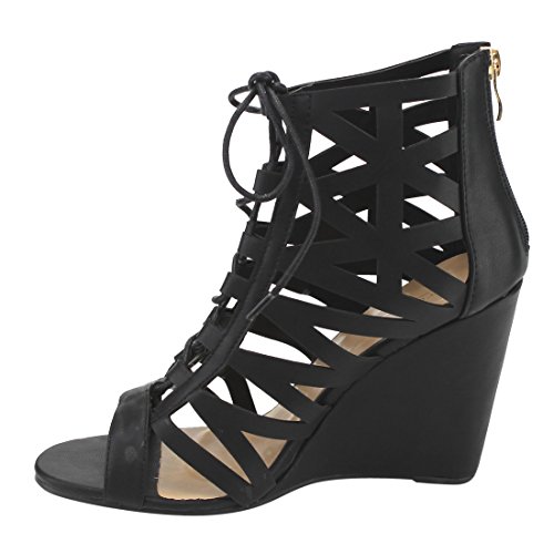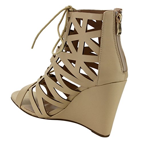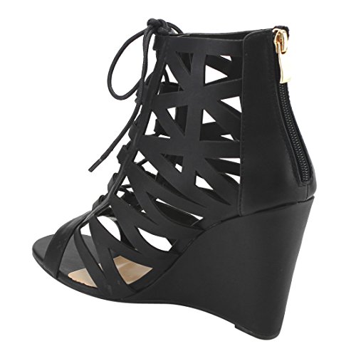 Product Description These caged wedge sandals are featuring a peep toe, cut out vamp design with adjustable laces front, a back zipper closure for easy slip on and wear, finished with a high wedge heel. 0