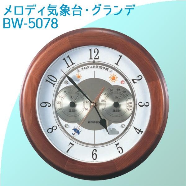 | 風格のある天然木枠とゴールドトーンの洗練された文字盤がおしゃれな大型サイズの気象台です。毎正時にはお天気に合わせたメロディが流れます。 |