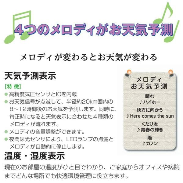 | 仕様 | 掛型 使用電源:単3乾電池×4 機能:天気予測、メロディ、温度計、湿度計、時計 |
